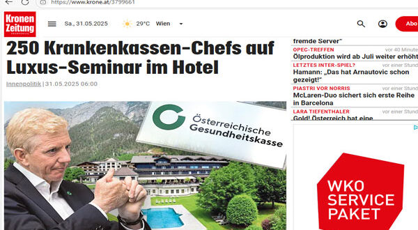 في وقت يضيق فيه الخناق على الخدمات الصحية المقدّمة للمواطنين، قررت قيادة الهيئة النمساوية للتأمين الصحي (ÖGK) قضاء يومين في فندق فخم بمنطقة سالزبورغ، حيث أقامت نُخبة من كبار مديريها – الذين يبلغ عددهم 250 شخصًا – ندوةً شاملة جمعت بين ورش عمل وبطولات جولف واستجمام في «واحة الرفاهية» التي يوفرها فندق Gut Brandlhof في سلفيلدن.