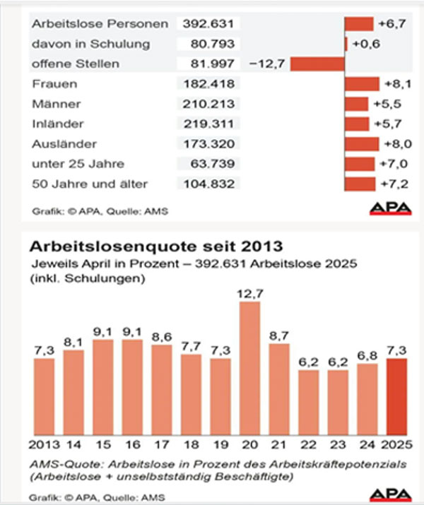 رغم تماسك الاقتصاد النمساوي مقارنة بجيران أوروبيين كُثر، إلا أن أرقام البطالة لشهر أبريل 2025 تدق ناقوس الخطر. فبحسب وزارة العمل، ارتفع عدد العاطلين عن العمل أو الملتحقين ببرامج تدريبية إلى ما يقارب 393 ألف شخص، بزيادة 6.7% عن العام الماضي، مع تسجيل معدلات مثيرة للقلق بين النساء، الشباب، والأجانب.
