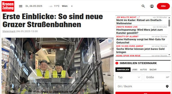 بعد طول انتظار، حصل الجمهور والصحافة أخيرًا على أول نظرة واقعية على عربات الترام الجديدة التي ستجوب شوارع مدينة غراتس النمساوية قريبًا. ففي مصنع شركة “ألستوم” بالعاصمة فيينا، تم الكشف عن أول نموذج شبه مكتمل من أصل 15 عربة سيتم تشغيلها تدريجيًا اعتبارًا من نهاية عام 2025.