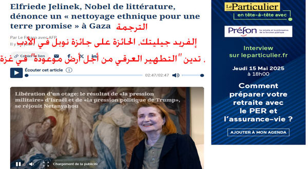في لحظة يصمتفي لحظة يصمت فيها كثيرون، وتعلو فيها أصوات التبرير والدفاع الأعمى، خرجت الروائية النمساوية الكبيرة إلفريدي يلينيك، الحائزة على جائزة نوبل للآداب عام 2004، لتُسمِع فيها كثيرون، وتعلو فيها أصوات التبرير والدفاع الأعمى، خرجت الروائية النمساوية الكبيرة إلفريدي يلينيك، الحائزة على جائزة نوبل للآداب عام 2004، لتُسمِع صوت الضمير الإنساني الحي من قلب أوروبا، وتصرخ بما لا يجرؤ كثيرون على البوح به: “دعوا الفلسطينيين يعيشون أيضاً”.