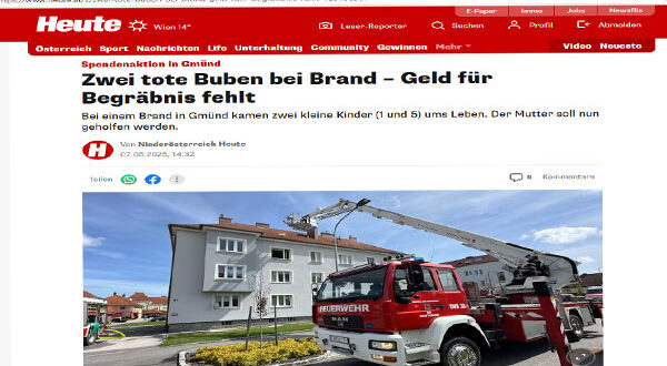 في فاجعة مؤلمة هزّت مدينة غموند النمساوية، لقي طفلان، لم يتجاوز أكبرهما الخامسة من العمر، مصرعهما في حريق اندلع داخل شقة سكنية أواخر أبريل، بينما ترقد والدتهما بين الحياة والموت في المستشفى، والنيابة العامة تفتح تحقيقًا قد ينتهي بمحاسبتها جنائيًا.