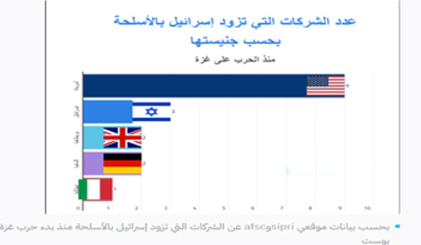 - ومن أبرز الشركات الأمريكية التي زودت إسرائيل بالأسلحة خلال الحرب على غزة لوكهيد مارتن، أر تي إكس، نورثروب غرومان، بوينغ، جنرال دينامكس، هانيويل الدولية وجنرال إليكتريك.