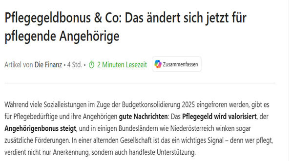 رغم التوجه العام نحو تقليص الميزانية وتجميد العديد من المساعدات الاجتماعية في إطار خطة التقشف لعام 2025، إلا أن الحكومة النمساوية أرسلت إشارة إيجابية وواضحة للمسنين ومقدمي الرعاية الأسرية: زيادات جديدة في “بدل الرعاية” (Pflegegeld)، ورفع قيمة “مكافأة الأقارب”، إلى جانب برامج دعم إضافية في بعض الولايات مثل النمسا السفلى (Niederösterreich).