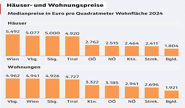 وفي المقابل، كانت بورغنلاند الأرخص بـ70 يورو للمتر، تليها كَرِنْتِن (85 يورو) وشتايرمارك (91 يورو). ويُعزى ارتفاع الأسعار في بعض الولايات الغربية إلى صفقات فاخرة محدودة في مناطق مثل كيتسبوهيل وليش.