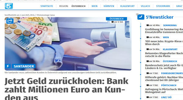 في تطور لافت يكشف حجم التجاوزات البنكية بحق المواطنين في النمسا، أعلنت “سانتاندير بنك” (Santander Consumer Bank) عن إعادة ملايين اليورو لعملائها، بعد أن أكد المحكمة العليا في النمسا (OGH) أن البنك فرض رسومًا غير قانونية وغير شفافة في مئات آلاف من عقود القروض.