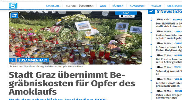 في مشهدٍ نادرٍ من الحزن النبيل والتضامن العملي، أعلنت بلدية مدينة غراتس النمساوية، اليوم الجمعة، تحمّلها الكامل لتكاليف دفن ضحايا مجزرة مدرسة BORG، التي هزّت البلاد وأدمت القلوب يوم الثلاثاء الماضي، وأودت بحياة عشرة أشخاص معظمهم من الأطفال والشباب.