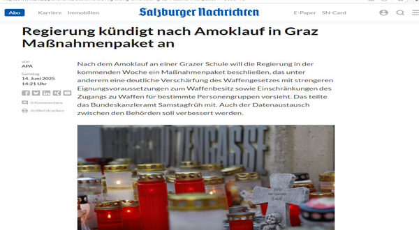 أعلنت الحكومة النمساوية عن حزمة إجراءات عاجلة بعد حادث إطلاق النار المأساوي الذي وقع في مدرسة بمدينة غراتس، وأسفر عن سقوط ضحايا بين الطلاب. وتعتزم الحكومة اعتماد هذه الحزمة خلال الأسبوع المقبل، على أن تتضمن تشديدًا كبيرًا في قانون حيازة الأسلحة، وتحسين التنسيق بين الجهات المعنية، بالإضافة إلى دعم نفسي ومالي للمتضررين.