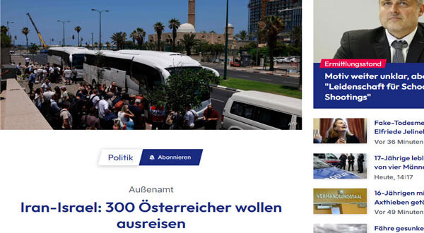 في ظل تصاعد التوترات الأمنية في منطقة الشرق الأوسط، أعلن وزارة الخارجية النمساوية أنها على تواصل مباشر مع نحو 300 نمساوي يرغبون في مغادرة كل من إيران وإسرائيل، وذلك وفقًا لما نقلته وكالة الأنباء النمساوية APA.