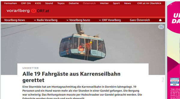 شهدت ولاية فورارلبرغ غرب النمسا حادثة درامية مساء الإثنين، حيث علق 19 شخصًا وكلب في عربة تلفريك على ارتفاع يصل إلى 80 مترًا، بعد أن تسببت عاصفة عنيفة في خروج الكابلات عن مسارها على جبل “كارن” الشهير بمدينة دورنبيرن. استمرت عملية الإنقاذ أكثر من سبع ساعات وسط ظروف جوية صعبة، وانتهت دون تسجيل أي إصابات.