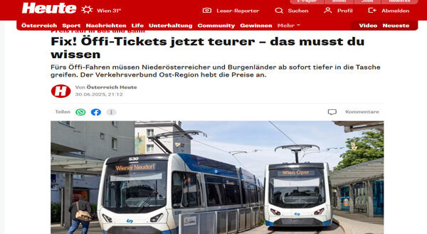 دخلت اليوم، الإثنين 1 يوليو 2025، زيادات جديدة في أسعار تذاكر المواصلات العامة حيز التنفيذ في ولايتي النمسا السفلى (نيدرأوسترايش) وبورغنلاند، وذلك ضمن خطة هيئة المواصلات لمنطقة الشرق (VOR) لمواكبة ارتفاع التكاليف التشغيلية وتوسيع شبكة النقل العام.