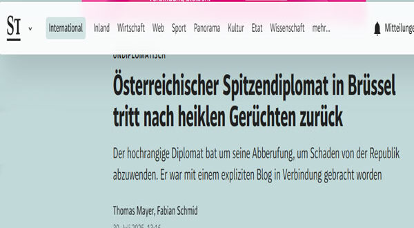 في تطوّر صادم للوسط الدبلوماسي النمساوي، أعلن الممثل الدائم للنمسا لدى الاتحاد الأوروبي، توماس أوبرايتر، استقالته من منصبه في بروكسل، على خلفية تقارير إعلامية ربطته بمدونة إلكترونية تحتوي على محتوى جنسي ومهين للنساء، ما أثار جدلًا واسعًا ودفعه إلى اتخاذ قرار الاستقالة تفاديًا لأي ضرر دبلوماسي أو أمني على الجمهورية.