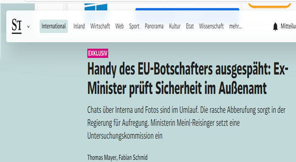 أمرت وزارة الخارجية النمساوية بفتح تحقيق عاجل بعد تسريبات مثيرة للقلق طالت هاتف السفير السابق لدى الاتحاد الأوروبي، توماس أوبررايتر، تضمنت محادثات شخصية ووثائق رسمية حساسة. وأثارت القضية، التي كشفت عنها صحيفة DER STANDARD، موجة من التوتر داخل الأوساط السياسية والدبلوماسية في البلاد، وسط مخاوف من وجود اختراق أمني على أعلى المستويات.