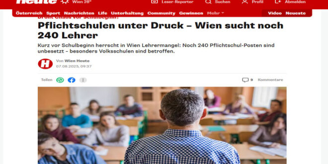 مع اقتراب موعد العودة إلى المدارس، تعيش المدارس الإلزامية في فيينا ضغطًا متزايدًا بسبب نقص حاد في أعداد المعلمين، حيث لا تزال المدينة تبحث عن 240 معلّمًا ومعلّمة لتغطية احتياجات العام الدراسي الجديد، خاصة في المدارس الابتدائية.