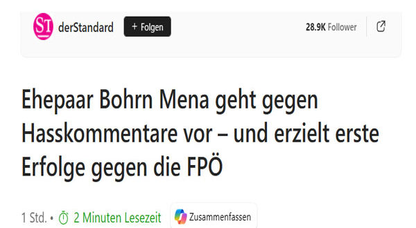 تمكن الزوجان النمساويان الناشطان في مجال حقوق الإنسان، فيرونيكا وسيباستيان بورن مينا، من تحقيق أولى الانتصارات القانونية ضد موجة من التعليقات المسيئة والتهديدات التي استهدفتهما على الإنترنت. ويواجه الزوجان منذ سنوات تهديدات بالعنف والقتل، وإهانات عنصرية، وشتى أشكال الإساءة على وسائل التواصل الاجتماعي.