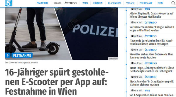 تمكّن فتى يبلغ من العمر 16 عامًا في العاصمة النمساوية فيينا من تعقّب سكوتره الكهربائي المسروق باستخدام تطبيق على هاتفه، ما أدى إلى إلقاء القبض على المشتبه به من قبل الشرطة.
