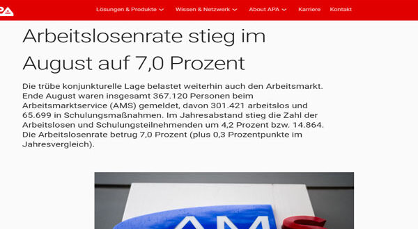 سجّل سوق العمل في النمسا خلال أغسطس ارتفاعاً جديداً في معدل البطالة، ليصل إلى 7%، وسط استمرار حالة الركود الاقتصادي وضعف النمو. ووفق بيانات خدمة سوق العمل (AMS)، بلغ عدد المسجلين لديها نهاية الشهر 367.120 شخصاً، منهم 301.421 عاطلاً عن العمل و65.699 في برامج تدريبية. وبالمقارنة السنوية، ارتفع عدد العاطلين والمشاركين في الدورات التدريبية بنسبة 4,2% أي ما يعادل 14.864 شخصاً.