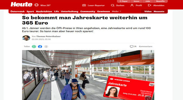 أعلنت شركة النقل في فيينا Wiener Linien عن قرب انتهاء فترة بطاقة النقل السنوية بسعر 365 يورو، إذ ستشهد الأسعار ارتفاعًا كبيرًا ابتداءً من 1 يناير 2026 لتصبح 467 يورو، أي بزيادة قدرها 102 يورو.