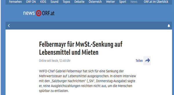 اقترح مدير المعهد النمساوي للبحوث الاقتصادية (WIFO)، غابرييل فيلبرماير، خفض ضريبة القيمة المضافة على المواد الغذائية والإيجارات بهدف تخفيف العبء عن المواطنين بشكل ملموس، معتبرًا أن المدفوعات التعويضية وحدها غير كافية لتحقيق هذا الهدف.