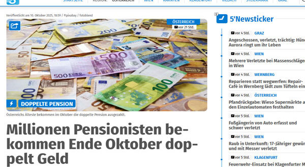 ينتظر نحو ثلاثة ملايين متقاعد في النمسا نهاية شهر أكتوبر الحالي على أحرّ من الجمر، إذ من المقرر أن يحصلوا على دفعة مالية مضاعفة تتجاوز في المتوسط ألف يورو إضافية في حساباتهم البنكية، فيما يُعرف باسم “المعاش المزدوج” الذي يُصرف مرتين سنويًا.