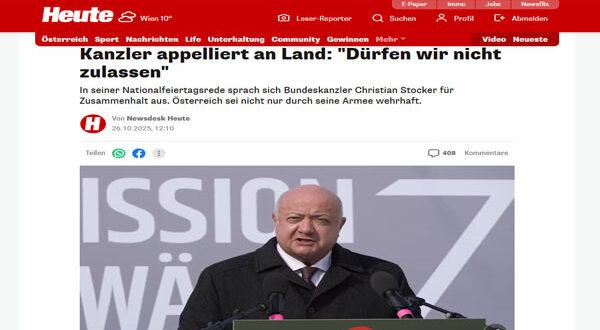 وجّه المستشار النمساوي كريستيان شتوكر (ÖVP) في خطابه بمناسبة العيد الوطني للنمسا دعوة مؤثرة إلى الوحدة الوطنية والدفاع عن الديمقراطية والحياد، مؤكدًا أن قوة البلاد لا تكمن في جيشها فقط، بل في تماسك مجتمعها واستقرار اقتصادها.