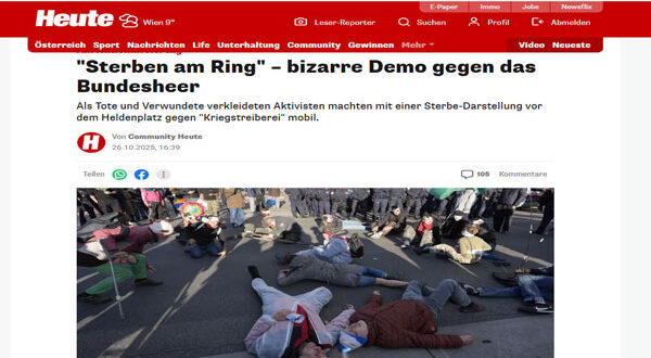 شهدت العاصمة النمساوية فيينا، اليوم السبت، مشهدًا غير اعتيادي على هامش احتفالات اليوم الوطني للنمسا (26 أكتوبر)، حيث نظّم ناشطون مظاهرة رمزية بعنوان «الموت على الرينغ – Sterben am Ring»، احتجاجًا على ما وصفوه بـ«النزعات العسكرية ودعم الحرب».