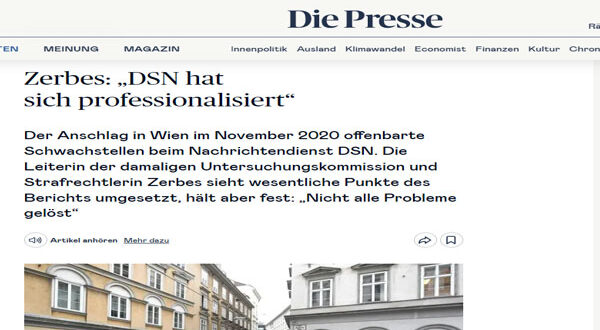 أكّدت الخبيرة القانونية النمساوية إنغبورغ زيربس، رئيسة لجنة التحقيق في هجوم فيينا الإرهابي عام 2020، أن جهاز الاستخبارات وحماية الدولة (DSN) أصبح أكثر مهنية وكفاءة خلال السنوات الأخيرة، لكنها شددت في الوقت ذاته على أن جميع المشاكل لم تُحل بعد.