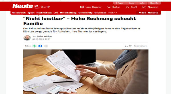 أثارت فاتورة نقل باهظة لعائلة في كارينثيا موجة من الغضب والاستياء، بعد أن اضطرت امرأة تبلغ 66 عامًا لدفع 87 يورو لكل رحلة لنقل والدتها البالغة من العمر 99 عامًا والمصابة بالخرف إلى مركز رعاية نهارية.