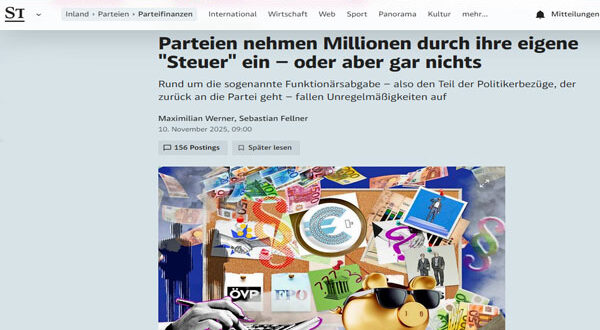 كشف تحقيق استقصائي موسّع أجرته صحيفة «دير شتاندارد» (Der Standard) ضمن مشروعها الجديد «أثر المال – Die Spur des Geldes»، عن آلية مالية غير معروفة على نطاق واسع تمكّن الأحزاب السياسية النمساوية من جمع ملايين اليوروهات سنويًا من خلال ما يُعرف بـ «الضريبة الحزبية» أو «مساهمة المسؤولين الحزبيين» (Funktionärsabgabe) — وهي نسبة تُقتطع من رواتب السياسيين وتُعاد إلى الحزب الذي ينتمون إليه.