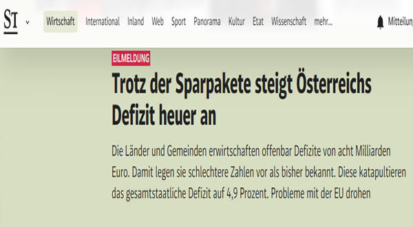 تواجه النمسا أزمة مالية جديدة بعد أن كشفت بيانات حديثة لصحيفة هويته (Heute) أن العجز في الميزانية العامة سيبلغ هذا العام 4.9% من الناتج المحلي الإجمالي، أي أكثر من التقديرات الحكومية السابقة البالغة 4.5%.