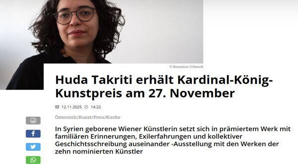 في إنجاز فني لافت، أعلنت أبرشية سالزبورج عن فوز الفنانة السورية المقيمة في فيينا هدى تكريتي بجائزة الكاردينال كينج للفنون لعام 2025، وهي واحدة من أرفع الجوائز في المشهد الثقافي والفني في النمسا.
