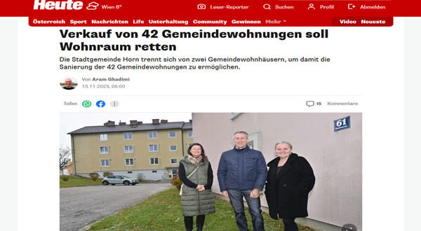 أعلنت بلدية هورن عن بيع 42 شقة سكنية بلدية في مبنيين بشارع Raabser 59 و61 لشركة Kamptal Gemeinnützige Wohnbaugesellschaft GmbH، على أن يصبح البيع ساري المفعول اعتبارًا من 31 ديسمبر 2025. وتهدف هذه الخطوة إلى تمويل أعمال التجديد وضمان استمرارية وصيانة الشقق على المدى الطويل.