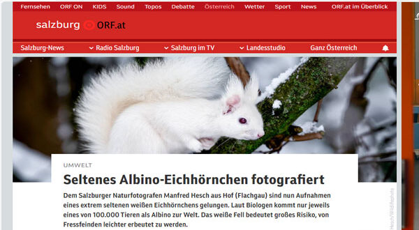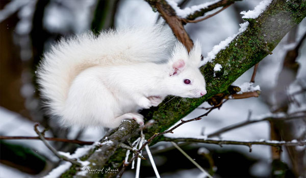 التقط المصور النمساوي Manfred Hesch من بلدة Hof في منطقة Flachgau – سالزبورغ صوراً نادرة لسنجاب أبيض أمهق، وهي حالة بيولوجية نادرة جداً تحدث مرة واحدة لكل 100,000 حيوان تقريباً. ويُعد الفراء الأبيض لهذه الحيوانات ميزة تجعلها أكثر عرضة للحيوانات المفترسة.