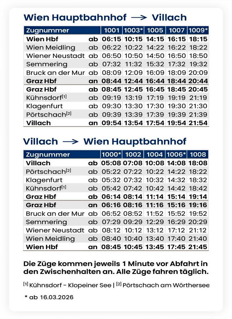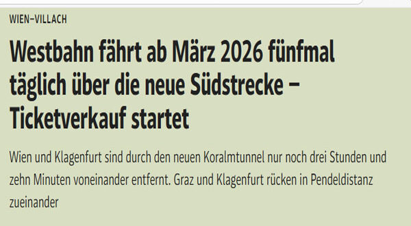 أعلنت شركة Westbahn الخاصة عن انطلاق خدماتها على المسار الجنوبي الجديد عبر خط كورالم بدءًا من مارس 2026، بخمس رحلات يوميًا تربط بين فيينا وغراتس وكلاغنفورت، في خطوة تعزز المنافسة مع شركة السكك الحديدية الحكومية ÖBB وتقلّص أزمنة السفر بين أهم مدن الجنوب النمساوي.