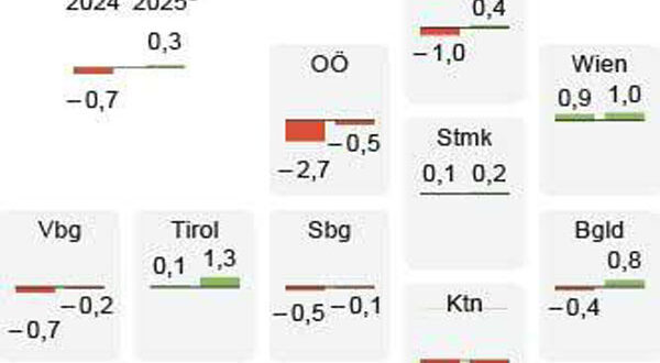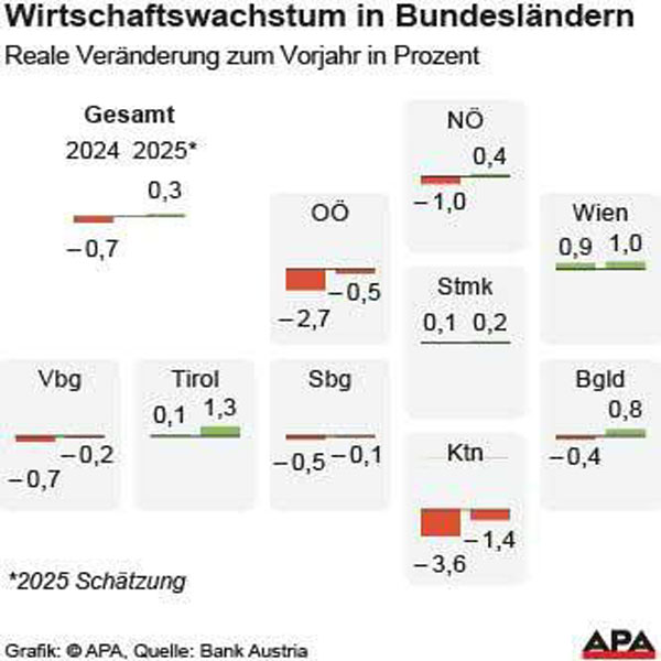 وبينما شهد الاقتصاد النمساوي تعافياً محدوداً بعد عامين من الركود، تبقى الصورة متباينة بين الولايات. فقد سجلت تييرول نموًا متوقعًا بنسبة 1.3٪، بينما واجهت الولايات الصناعية مثل أوبرأوسترايش وكارينثيا تراجعًا في الأداء الاقتصادي بنسبة تصل إلى -0.5٪ و**-1.4٪** على التوالي.