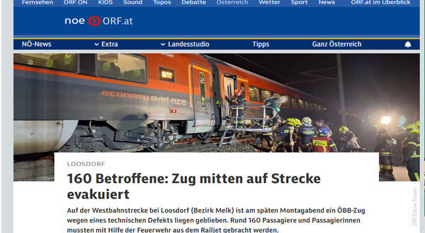 شهدت سكة قطارات الغرب في النمسا حادثًا طارئًا، بعد تعطل قطار تابع لشركة السكك الحديدية النمساوية (ÖBB) في وقت متأخر من مساء الاثنين، ما أدى إلى إجلاء نحو 160 راكبًا من القطار في منطقة لوسدورف التابعة لإقليم ميلك.