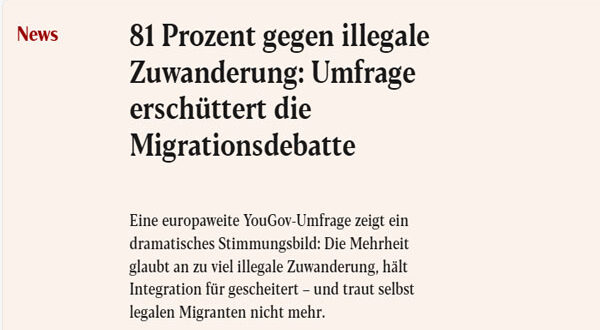 وبشكل عام، أعرب 68 إلى 81٪ من المستطلعين عن رفضهم للمستوى الحالي للهجرة غير القانونية، معتبرين إياه عاليًا جدًا أو مرتفعًا قليلًا. حتى الهجرة القانونية تواجه تشكيكًا واسعًا، حيث اعتبرت أغلبية الألمان (57٪) والفرنسيين (52٪) أن مستويات الهجرة الشرعية مرتفعة جدًا.