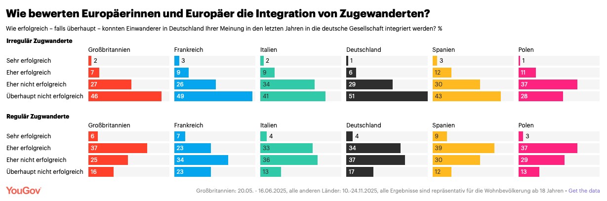 أما المهاجرون النظاميون، فتظهر نتائج الاستطلاع مزيدًا من الاختلاف، لكنها تبقى محفوفة بالشكوك. في ألمانيا اعتبرت 54٪ الاندماج غير ناجح، وفي فرنسا 57٪، وإيطاليا 49٪.