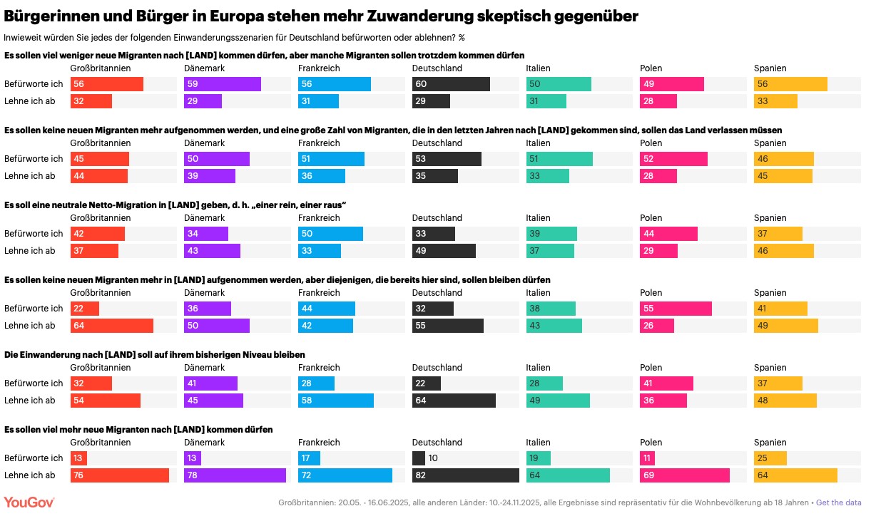 أظهر الاستطلاع أن نحو نصف الأوروبيين تقريبًا (45–53٪) يدعمون سيناريو صارم يشمل وقف الهجرة الجديدة وإعادة من وصل مؤخرًا إلى بلدانهم الأصلية، بما في ذلك عمليات الترحيل عند الضرورة.