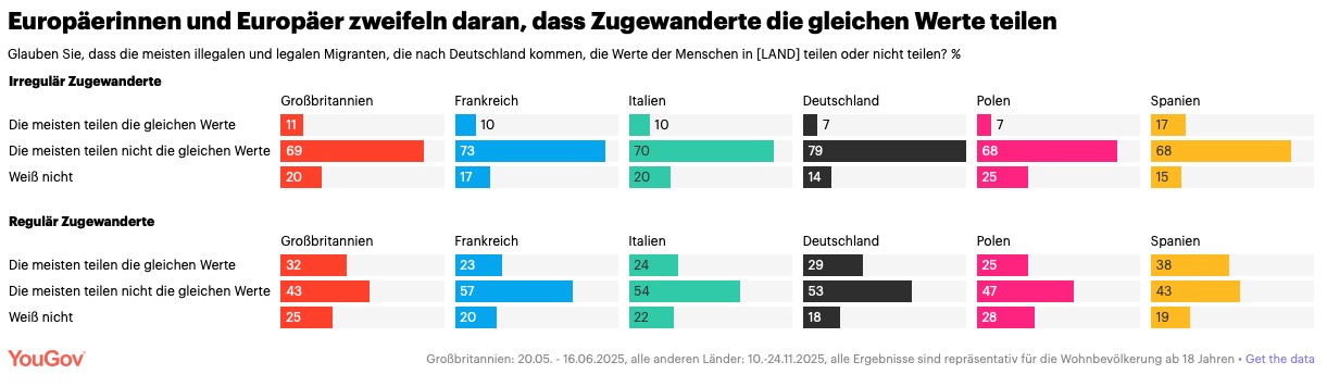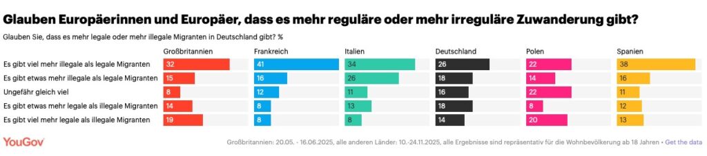 أظهر الاستطلاع، الذي أجرته شركة YouGov في ألمانيا وفرنسا وإيطاليا وإسبانيا، أن غالبية المشاركين ترى أن الهجرة غير النظامية تفوق النظامية. ففي إيطاليا، اعتبر نحو 60٪ من المواطنين أن عدد المهاجرين غير الشرعيين أعلى من المهاجرين النظاميين.