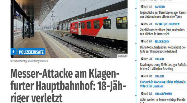 شهدت محطة القطارات الرئيسية في كلاغنفورت مساء الجمعة حادثة طعن خلال شجار بين مجموعة من الأشخاص، أسفرت عن إصابة شاب يبلغ من العمر 18 عامًا بجروح نقل على إثرها إلى المستشفى لتلقي العلاج.
