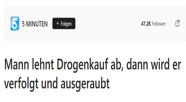 تعرض رجل يبلغ من العمر 46 عامًا في مدينة فيينا، مساء الأحد، لاعتداء وسرقة من قبل شخصين بالقرب من محطة مترو Gumpendorfer Straße، المشهورة باسم سوق المخدرات في المدينة. وبحسب الشرطة، بدأت الواقعة عندما عرض الشابان مواد مخدرة على الرجل، وعند رفضه الشراء، قاموا بضربه وسلب محفظته وهاتفه المحمول.