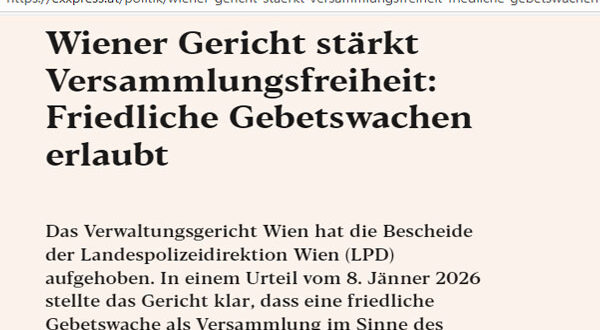 “أكدت المحكمة الإدارية في فيينا أن الصلاة السلمية تُعد تجمعًا محميًا بموجب الدستور. فحرية التجمع والرأي تكفلان حق التعبير العلني السلمي، بما في ذلك الدعوة إلى حماية الحياة البشرية.”
