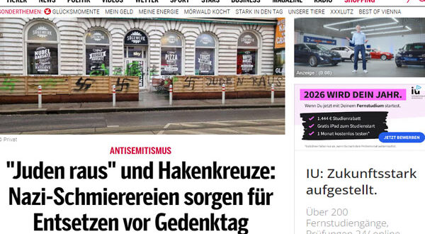 أثارت كتابات نازية معادية لليهود موجة استنكار واسعة في العاصمة النمساوية فيينا، بعدما أقدم مجهولون، ليل الأحد–الاثنين، على تشويه واجهة أحد المحال في شارع Währinger Straße بالحي التاسع، مستخدمين رموز الصليب المعقوف وشعار “اليهود إلى الخارج”.