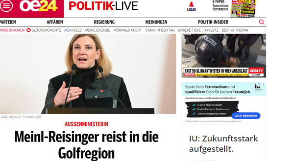 أكدت وزيرة الخارجية النمساوية بيات مينل-رايزينغر أن منطقة الخليج باتت تمثل شريكًا محوريًا لبلادها، ليس فقط على المستويين الاقتصادي والتجاري، بل أيضًا في قضايا السياسة الأمنية والاستقرار الإقليمي، وذلك في ختام جولة خليجية استمرت خمسة أيام شملت سلطنة عُمان والمملكة العربية السعودية والإمارات العربية المتحدة.