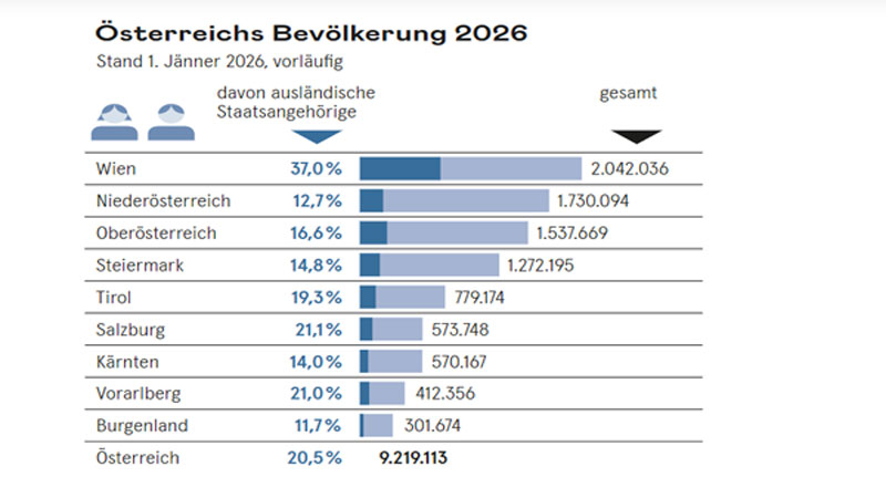وأظهرت البيانات أن عدد السكان من حاملي الجنسيات الأجنبية بلغ مع بداية 2026 نحو 1.89 مليون شخص، أي ما يعادل 20.5% من إجمالي سكان النمسا، بارتفاع طفيف مقارنة بالعام السابق.