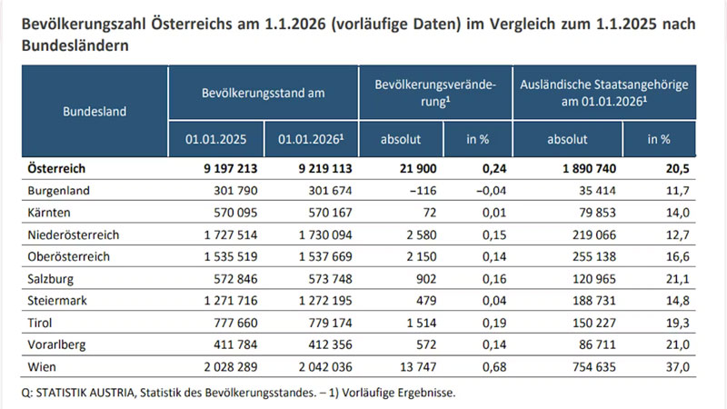 أظهرت بيانات أولية صادرة عن هيئة الإحصاء النمساوية أن عدد سكان النمسا مع بداية عام 2026 بلغ نحو 9.219.113 نسمة، مسجّلًا زيادة قدرها 21,900 شخص فقط مقارنة ببداية عام 2025، وهو معدل نمو أقل بكثير من السنوات السابقة، في اتجاه مستمر للتباطؤ السكاني.