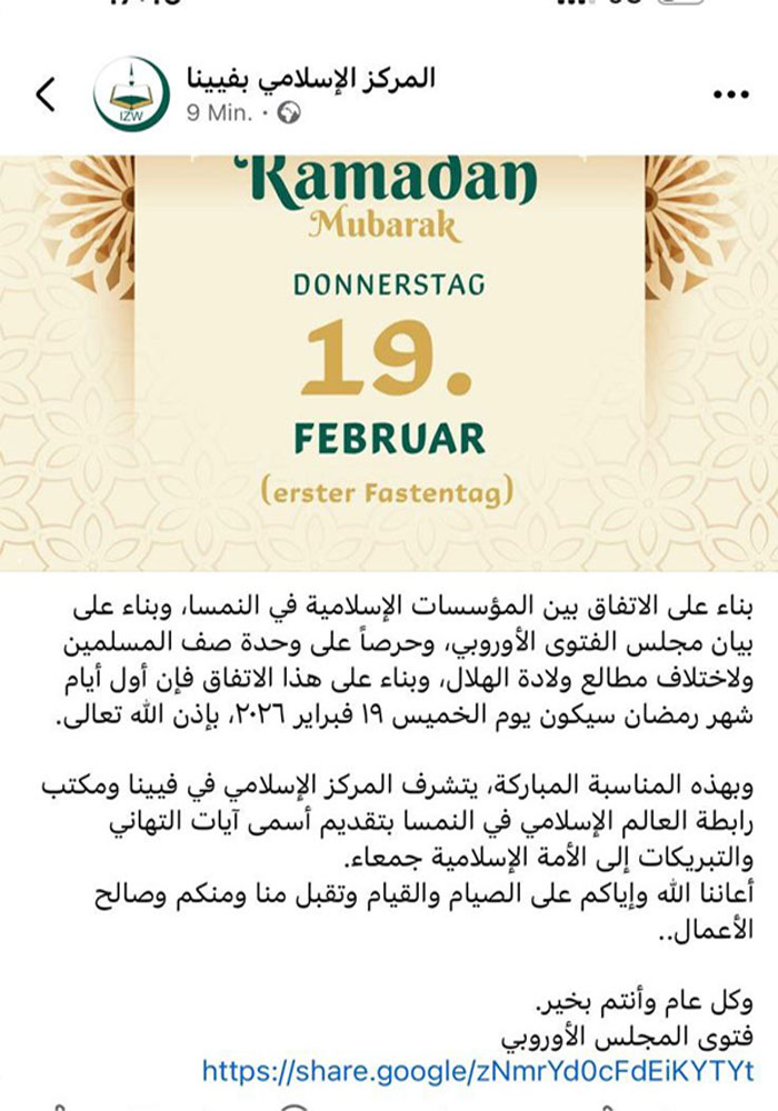 وجاء هذا الإعلان بعد التنسيق مع المجلس الأوروبي للإفتاء والبحوث، وأخذ اختلاف مطالع الهلال بعين الاعتبار، بهدف تحديد رؤية شرعية موحدة تحافظ على وحدة المسلمين في النمسا وتجنب التباين في مواعيد الصيام بين مختلف الولايات والمراكز الإسلامية.