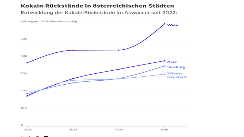وبحسب البيانات التي تعتمد على نظام الرصد الأوروبي لمخلفات المخدرات في مياه الصرف، والتي تشارك فيها فيينا منذ عام 2022، فقد ارتفع متوسط تركيز الكوكايين من نحو 371 ملغ لكل 1000 نسمة آنذاك إلى 595 ملغ في العام الماضي، ما يمثل زيادة تقارب 60% خلال أربع سنوات من القياس.
