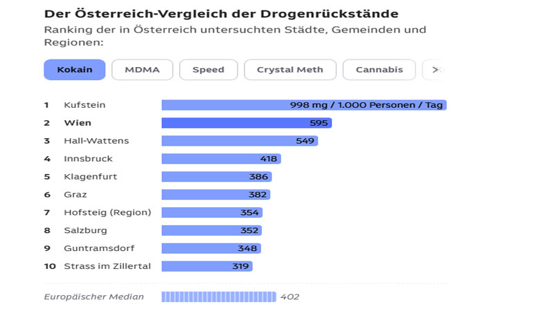 على المستوى الأوروبي، تصنف فيينا في المرتبة التاسعة بين العواصم من حيث تركيز بقايا الكوكايين في مياه الصرف، ما يضعها ضمن قائمة المدن العشر الأولى في هذا المؤشر.