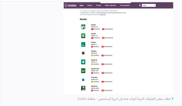 ويُظهر البحث في التطبيقات الدينية المخصصة للمسلمين على موقع منظمة “Exodus Privacy”، المتخصصة في فحص تطبيقات أندرويد لرصد متتبعات البيانات والأذونات المضمنة فيها، أن بعض هذه التطبيقات يضم أكثر من 10 متتبعات، فيما تتجاوز الأذونات التي تطلبها عشرات الصلاحيات.